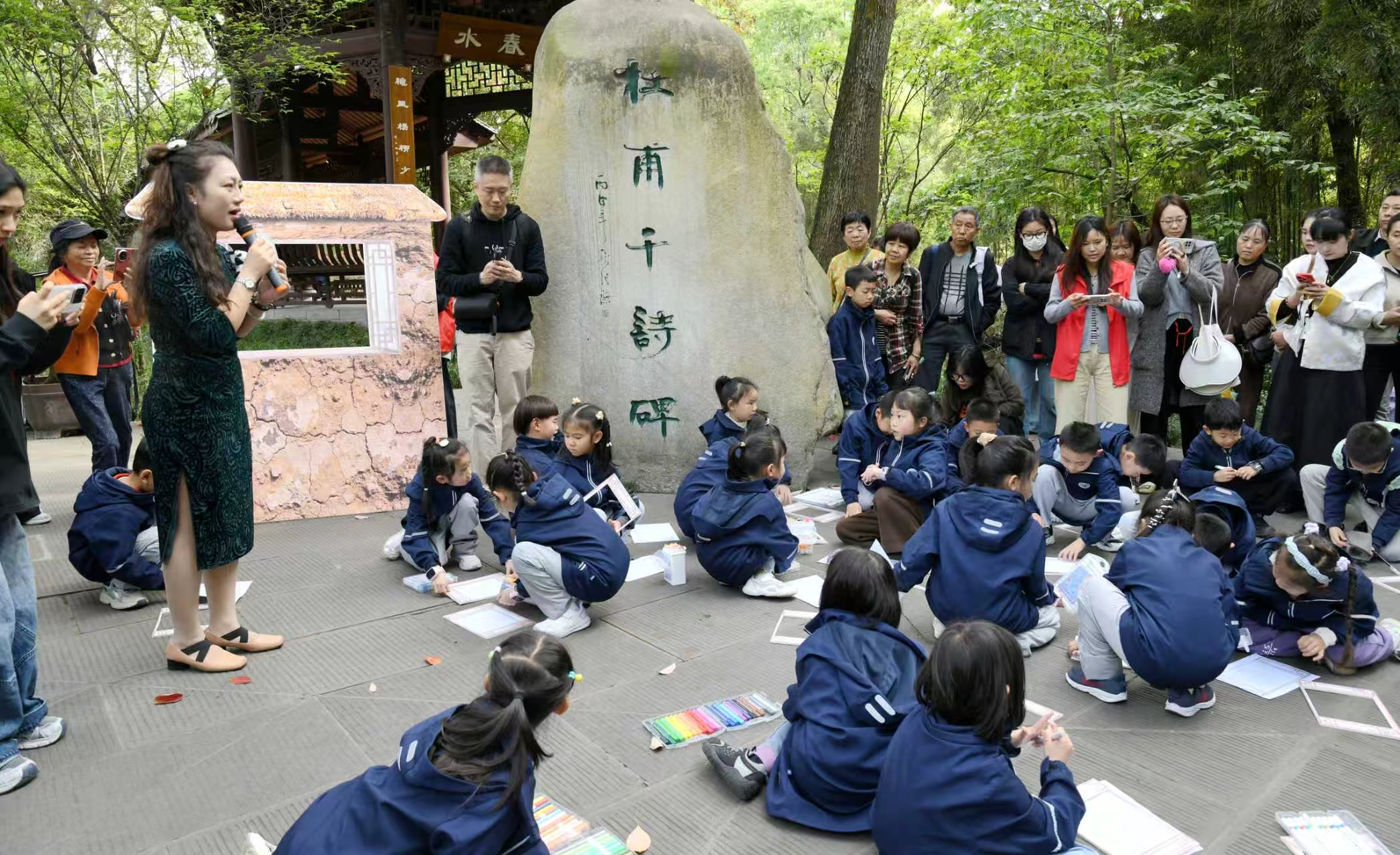 手中拿着纸张,穿梭在草木葱郁的曲折小径,一路走走停停,还不时吟诵诗句,席地而坐将观察到的景色描绘于纸上……4月伊始,当人们来到成都杜甫草堂博物馆,也许会碰到这样一群学生,他们在诗圣故居诵诗、品诗、悟诗,在实景中理解杜甫《绝句》的诗歌意境。而这就是杜甫草堂推出的首场“草堂一课”公益研学活动,在春假首日正式开课。